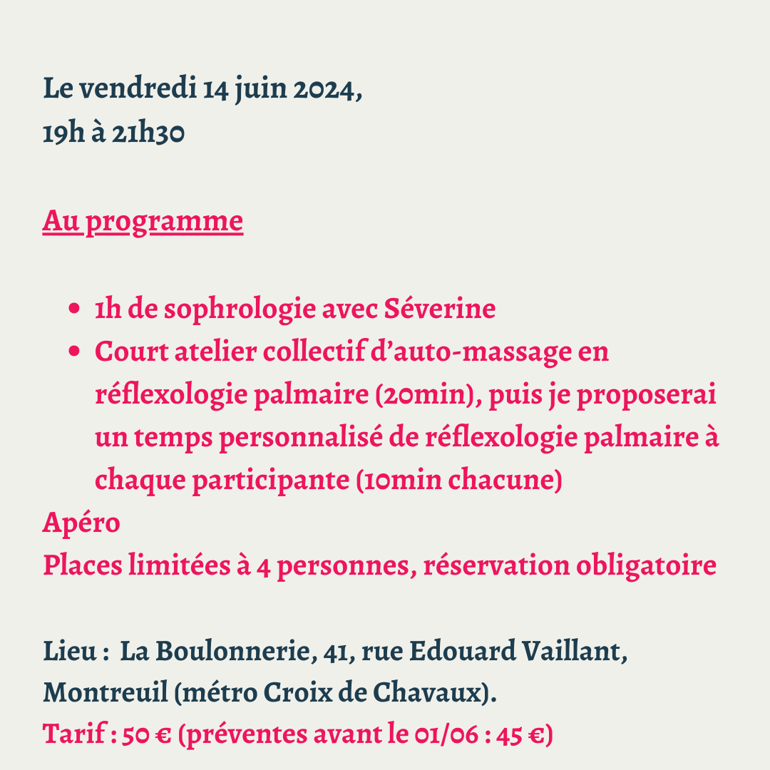 - Court atelier collectif d’auto-massage en réflexologie palmaire (20min), ensuite je prendrai 10min pour chacune des participantes pour leur offrir un temps de réflexologie palmaire, personnalisé en fonction de leurs envies et besoins